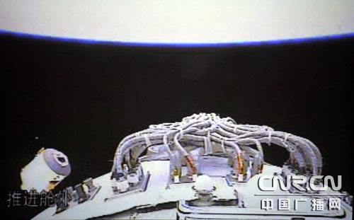 神七軌道艙返回艙分離。(中廣網記者南光 曹囡囡攝)