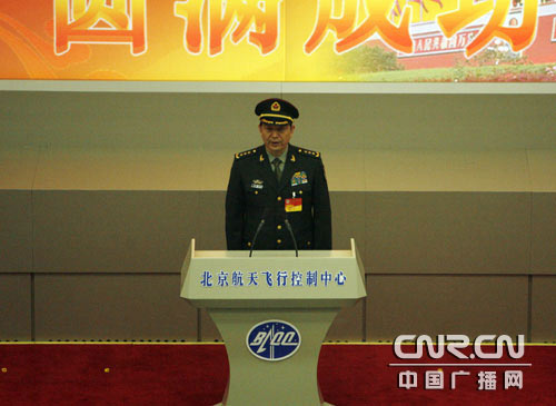 載人航天工程總指揮、中央軍委委員、解放軍總裝備部部長常萬全部長宣布神舟七號載人航天飛行任務結果。(中廣網記者南光 曹囡囡攝)