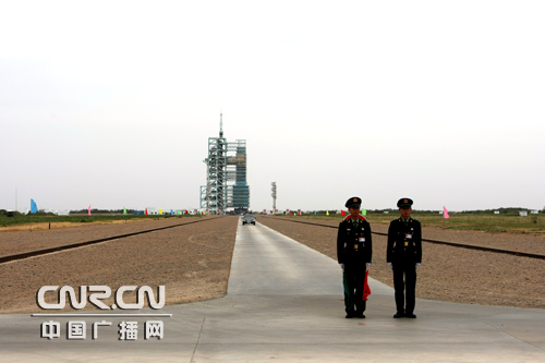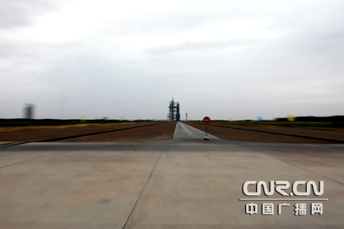北京時間9月25日17點整,承載著神舟七號飛船的長征2F運載火箭靜靜的矗立在中國酒泉衛星發射中心。(中廣網記者 紀樂樂 攝)