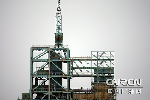 火箭頂端的回轉平臺將會第一個打開,屆時,火箭的逃逸塔部分將首先展示在大家面前。(中廣網記者 紀樂樂 攝)