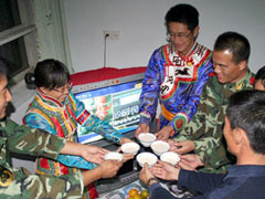 9月26日,航天員劉伯明在神舟七號飛船軌道艙內進行艙外航天服組裝與測試(攝于北京航天飛行控制中心大屏幕)。新華社記者 查春明 攝