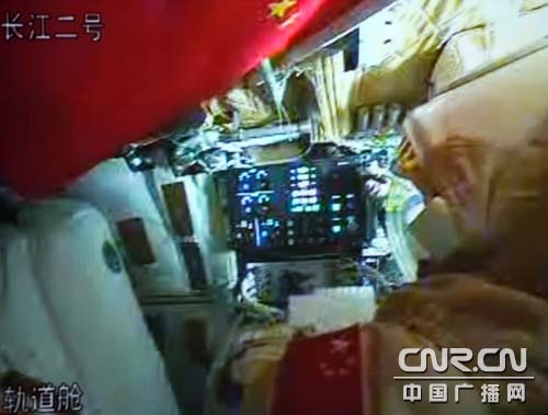 中廣網北京航天飛行控制中心9月26日快訊(記者曹囡囡 南光)軌道艙內,兩位航天員正在穿著艙外航天服。23:39,記者從指揮大廳顯示屏看到,航天員翟志剛、劉伯明剛剛穿著艙外航天服在軌道艙內進行按鍵操作。