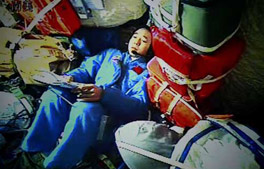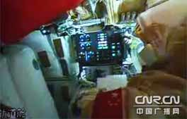 9月27日,航天員翟志剛在神舟七號載人飛船軌道艙進行出艙前的準備工作(攝于北京航天飛行控制中心大屏幕)。當日中午,航天員出艙活動任務開始。新華社記者查春明攝