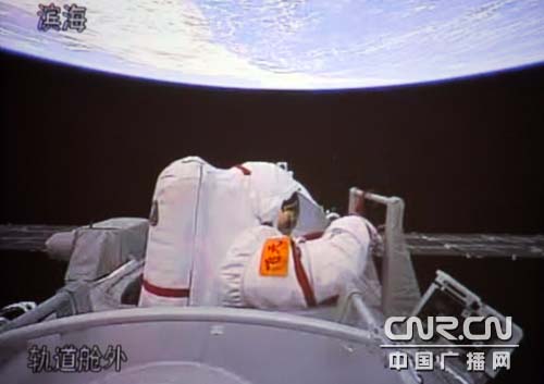 航天員翟志剛正在出艙。(中廣網(wǎng)記者南光 曹囡囡攝)