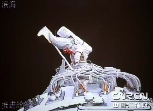 航天員翟志剛把安全掛鉤掛在飛船艙外的欄桿上。(中廣網記者南光 曹囡囡攝)