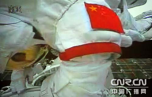 航天員翟志剛身著我國自主研制的艙外航天服“飛天”。(中廣網記者南光 曹囡囡攝)