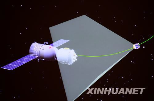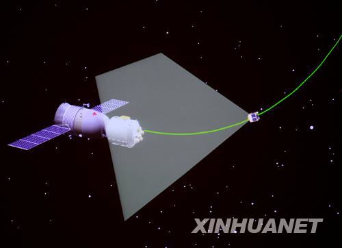 9月27日,在完成航天員出艙任務(wù)后,神舟七號(hào)飛船在太空釋放一顆伴飛小衛(wèi)星(攝于北京航天飛行控制中心大屏幕)。新華社記者查春明攝