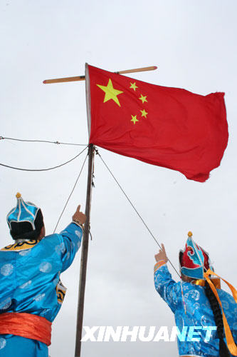 9月27日,居住在神七著陸區的牧民巴特爾(左)和托婭在草原上升起國旗,期盼飛船安全著陸。