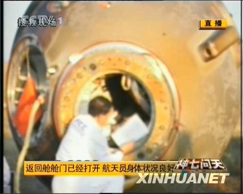 9月28日,神七返回艙艙門打開。 新華社發(fā)(電視截圖)