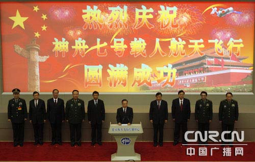 載人航天工程總指揮、中央軍委委員、解放軍總裝備部部長常萬全部長宣布神舟七號載人航天飛行任務(wù)結(jié)果。(中廣網(wǎng)記者南光 曹囡囡攝)