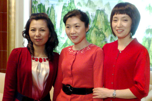 9月27日,神七航天員妻子集體亮相,與太空中的丈夫進行天地通話。左起:劉伯明妻子張瑤,景海鵬妻子張萍,翟志剛妻子張淑靜。