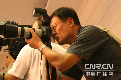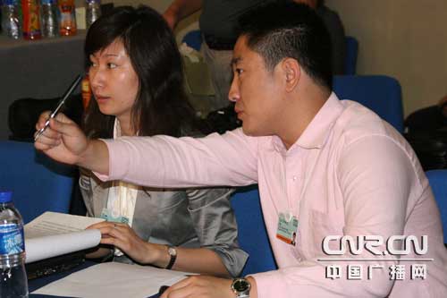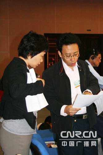 中央臺記者馮悅與大連站記者賈鐵生討論連線報道計劃