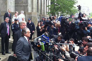 資料圖片:5月16日,國(guó)際貨幣基金組織總裁多米尼克·斯特勞斯-卡恩(右)出席紐約曼哈頓刑事法院舉行的聽(tīng)證會(huì)。在...