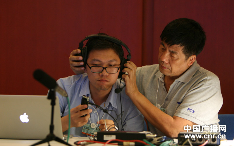 技術中心周俊生給經濟之聲記者黃耀偉戴監聽耳機。(中廣網記者 陳曉冉 攝)