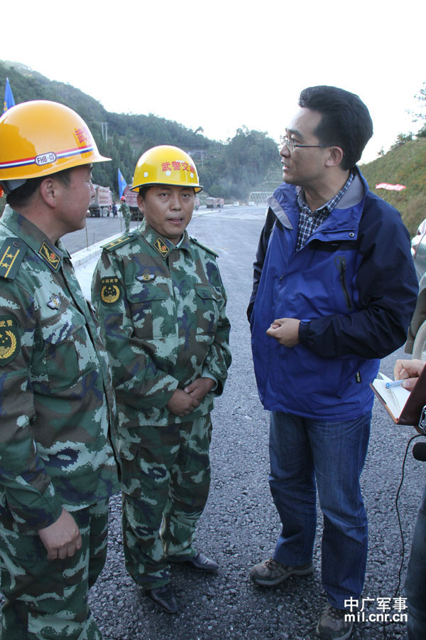 中央臺記者梁永春采訪武警交通部隊官兵(中廣網記者劉鵬攝)