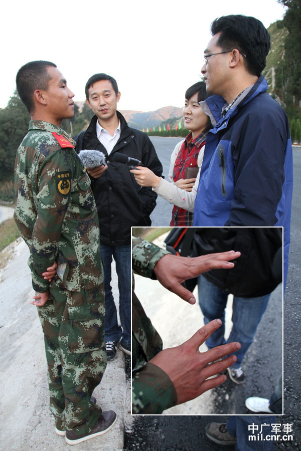 中央臺記者孫杰、王嫻、梁永春在施工現場采訪90后武警戰士(中央臺記者劉鵬攝)