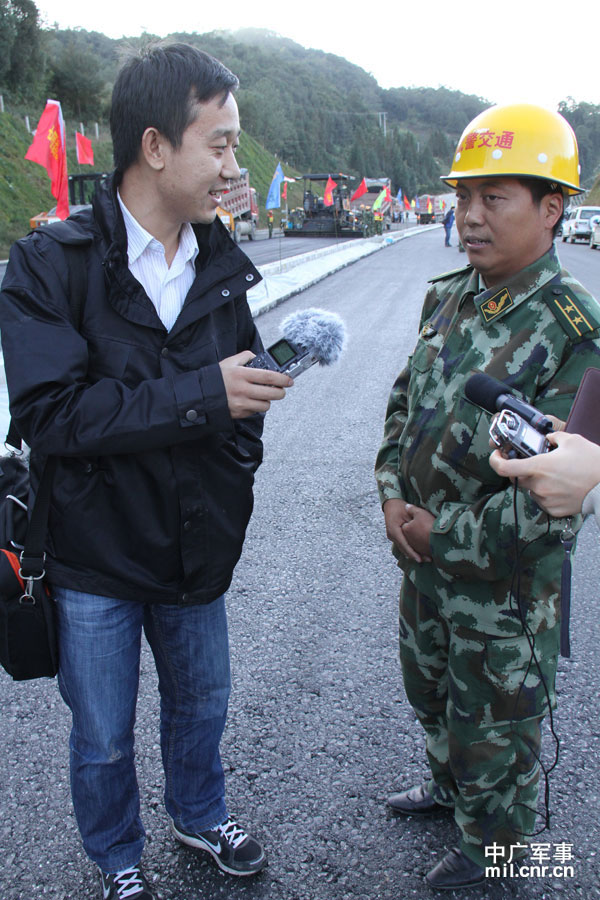 中央臺(tái)記者孫杰采訪武警交通部隊(duì)官兵(中央臺(tái)記者劉鵬攝)