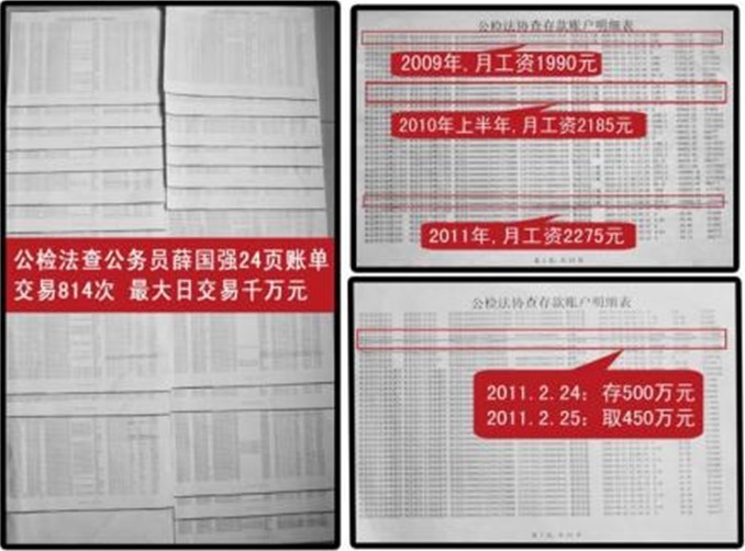 近日,有網友發帖稱,自己撿到一個檔案袋,袋中銀行賬戶過賬資料顯示,戶主薛國強從2006年6月至2011年3月,在農信社賬戶交易814次,其中單日最大交易額達1000萬元,一日數百萬元、數十萬元的交易額度有多次。網友還發現,薛國強系河南省平頂山市郟縣的公職人員,網友質疑其“日出千萬”收支的合法性。