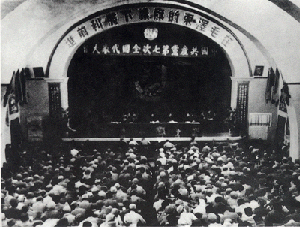 1945年4月23日至6月11日,中國共產黨第七次全國代表大會在延安楊家嶺中央大禮堂召開,歷時50天。出席大會的正式代表547名,候補代表208名,共計755名,代表全國121萬黨員。大會選出毛澤東、朱德、劉少奇、周恩來、任弼時、林伯渠、彭德懷、康生、陳云、陳毅、賀龍、徐向前、高崗、張聞天、彭真15人組成主席團,選舉任弼時為大會秘書長、李富春為副秘書長。