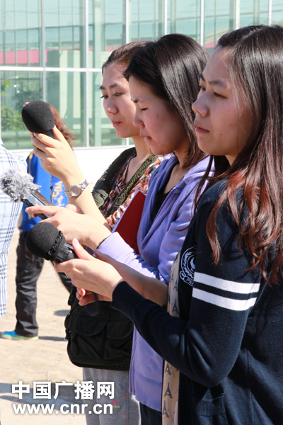 中國之聲記者杜希萌(左)、劉黎黎(中)、楊寧(右)在《傾聽新疆》走轉(zhuǎn)改采訪活動中現(xiàn)場錄音