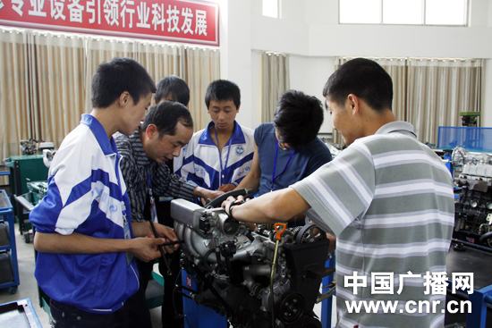 學校汽修車間內,師生們動手操作(中廣網 李雨楠攝)
