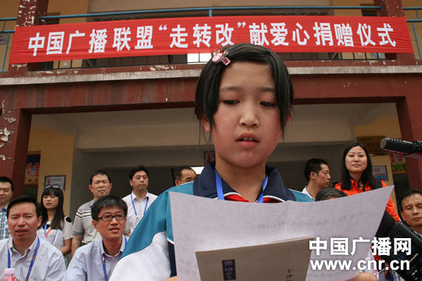 紅星楊小學學生代表感謝采訪團愛心捐贈(中廣網記者董浩攝)
