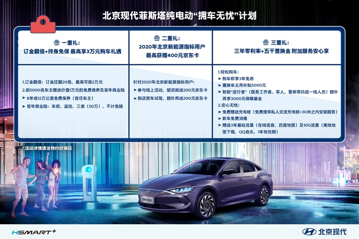 針對獲得2020年北京新能源指標的準車主,只要參與北京現代線上活動,留資并通過驗證即可直接獲得200元京東卡;注冊會員并到店賞車試駕,還可額外獲得200元的京東卡,累計價值400元。此外,消費者還可享受3年免息政策,而對于置換用戶來說,還可在此基礎上獲得5000元置換補貼。特別值得一提的是,為致敬抗擊一線的“逆行者”,包括醫務工作者、軍人、警察等還可額外享受3000元保障基金。