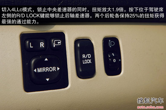 多數(shù)情況下,系統(tǒng)通過電子輔助系統(tǒng)鎖止打滑的車輪即可脫困,這在多數(shù)SUV車型上并沒有普及。而勁暢切換至4LLc狀態(tài),并按下R/D Lock,此時(shí)后橋差速器也會(huì)鎖止,并關(guān)閉ABS和電子限滑裝置,兩個(gè)后輪始終各擁有25%的動(dòng)力,獲得最強(qiáng)的通過性。