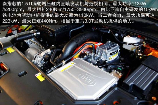 動(dòng)力方面:秦搭載的1.5TI渦輪增壓缸內(nèi)直噴發(fā)動(dòng)機(jī)與速銳相同,最大功率113kW/5200rpm,最大扭矩240N.m/1750-3500rpm,由比亞迪自主研發(fā)的10kWh鐵電池為驅(qū)動(dòng)電機(jī)提供的最大功率為110kW。當(dāng)二者合力,最大功率可達(dá)223kW,最大扭矩440Nm。傳動(dòng)方面,該車匹配的是一臺(tái)DCT雙離合變速箱,官方表示該車0-100km/h的加速時(shí)間為5.9秒。