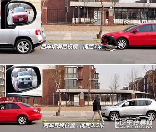 小車在前,SUV在后:當后車充滿后視鏡時,前后車距為3.5米左右。