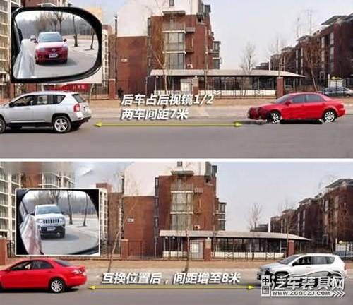 小車在前,SUV在后:當后車充滿后視鏡的2/3時,前后車距為8米左右。