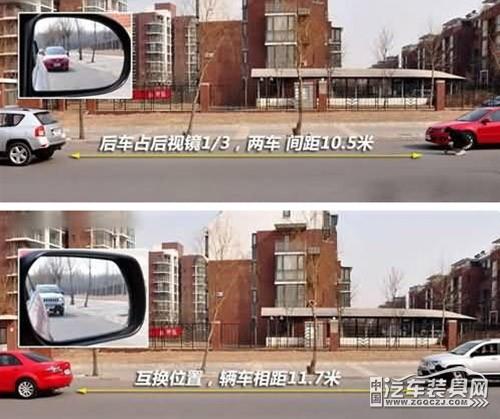 SUV在前,小車在后:當后車充滿后視鏡的1/3時,進行測量后發現前后車差距為10.5米左右。