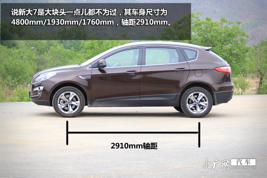 說新大7是大塊頭一點兒都不為過,其車身尺寸為4800mm/1930mm/1760mm,軸距2910mm。數(shù)據(jù)上除高度以外都超過了沃爾沃XC90,逼近奔馳ML級中大型SUV。而其整備質(zhì)量也達到 1960千克。