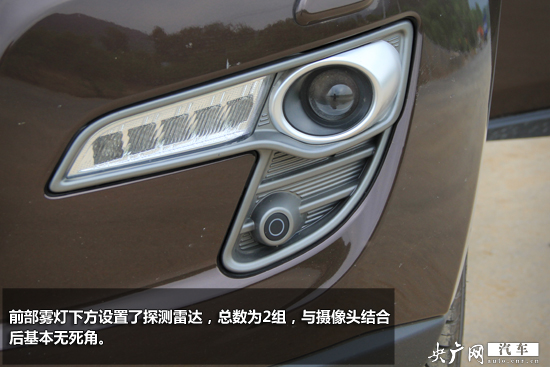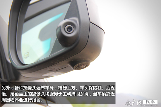 另外,各種攝像頭遍布車身,格柵上方、車頭保險杠、后視鏡、尾箱蓋上的攝像頭均服務(wù)于主動鷹眼系統(tǒng),當車輛靠近周圍物體會進行報警。前部霧燈下方設(shè)置了探測雷達,總數(shù)為2組,與攝像頭結(jié)合后基本無死角。