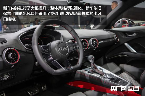 新車內飾進行了大幅提升,整體風格得以簡化。新車依舊保留了圓形出風口但采用了類似飛機發動涵道樣式的出風口結構,可分別控制空調的開關、風速、以及溫度。而側方的出風口則換成了座椅加熱的啟動鍵。此外,車內配備了三幅平底方向盤,底部配有TTS專屬徽章。新款TTS將全部信息集成到了駕駛席的12.3寸顯示系統上,MMI液晶顯示屏的功能被取代。