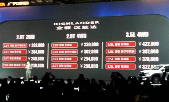 3月20日,廣汽豐田全新漢蘭達在正式上市,售價為23.98-42.28萬元。據悉,這款新車包括2.0T/3.5兩個排量,根據配置不同共有12款車型,3.5L的車型起售價為32.28萬元,相比老款車型價格略有下調。