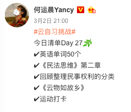 假期延長(zhǎng)后,北京航空航天大學(xué)法學(xué)院碩士生何運(yùn)晨便在微博發(fā)起“云自習(xí)挑戰(zhàn)”,邀請(qǐng)網(wǎng)友一起微博打卡,分享每日的學(xué)習(xí)內(nèi)容、心得體會(huì),同時(shí)邀請(qǐng)自己的朋友做“云監(jiān)工”。這段日子里,很多網(wǎng)友都跟隨著何運(yùn)晨和“云監(jiān)工”們的腳步每日?qǐng)?jiān)持打卡。