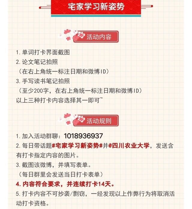 如四川農(nóng)業(yè)大學(xué)發(fā)起的“宅家學(xué)習(xí)新姿勢(shì)”,學(xué)生如果按要求連續(xù)打卡14天,還可以獲得1分第二課堂賦分。也有些“學(xué)霸”則是按照自己的節(jié)奏,合理安排居家學(xué)習(xí)。