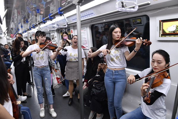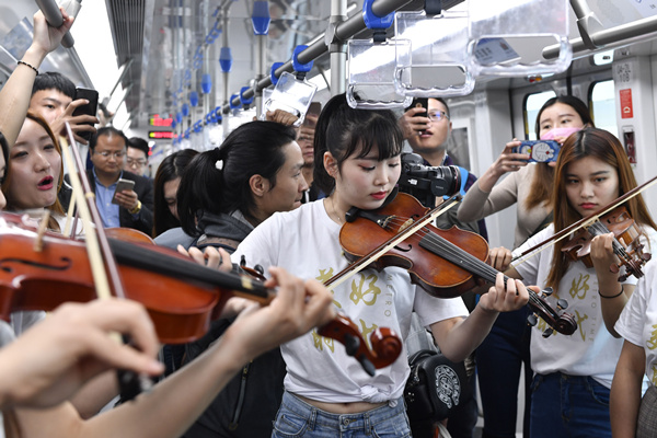 當(dāng)日,在合肥軌道交通2號(hào)線車廂,“好一朵美麗的茉莉花”伴隨著一首清脆小提琴合奏《茉莉花》的音樂聲,一場(chǎng)文化藝術(shù)秀正在精彩上演。