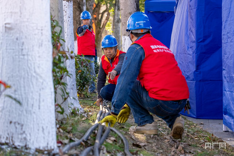 國網(wǎng)黃山區(qū)供電公司黨員服務(wù)隊正在鋪設(shè)專用線路(央廣網(wǎng)發(fā) 吳暢紅攝)