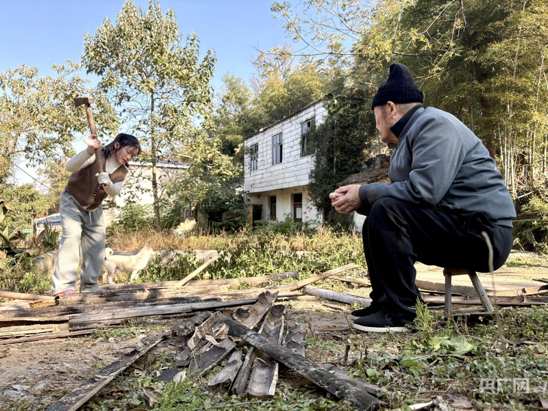 央廣網安慶11月30日消息(記者徐秋韻 通訊員劉正平)初冬的陽光,透過樹梢灑在宿松縣涼亭鎮楓驛村吳亞春家的小院里。26歲的吳亞春正在院中劈柴,身形單薄的她微微踮腳,將斧頭舉過頭頂,再用力劈向木柴,動作不算嫻熟,甚至帶著幾分笨拙。“慢著點,對準柴的裂痕劈!”她的養父吳育林坐在一旁的小板凳上,目光始終沒離開女兒的身影。吳育林因食道癌治療顯得有些消瘦,卻執拗地守在一旁,時不時出聲指導。父女倆的身影在陽光下依偎在一起,藏著說不盡的溫情。