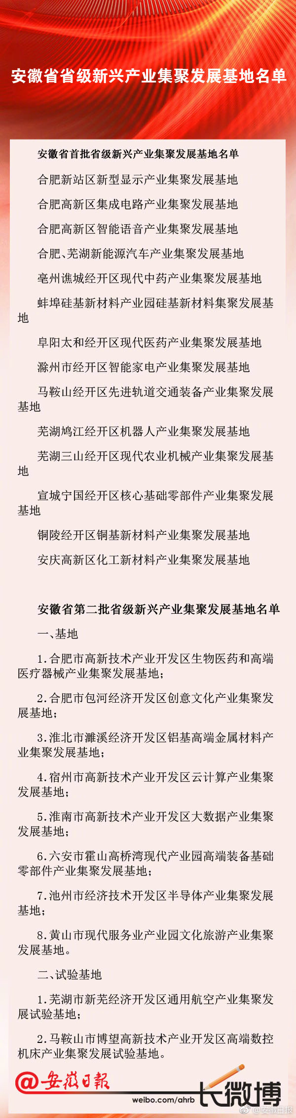 安徽全力推進省級戰略性新興產業集聚發展基地建設。2015年,安徽省政府確定了第一批省級戰略性新興產業集聚發展基地,合肥新站區新型顯示產業集聚發展基地等14家入圍。2016年,省政府確定第二批10家戰略性新興產業集聚發展基地,其中基地有8家,試驗基地有2家。目前,安徽省戰略性新興產業集聚發展基地共有24家。