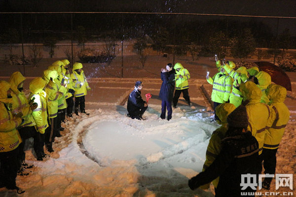 1月25日晚19時許,一名員工把魯亞萍“騙”到現場,面對此情此景和單膝下跪遞上“鮮花”的小查,小魯感動地熱淚盈眶。兩人在風雪中相擁,眾人舉起手機拍下視頻和照片為他們歡呼喝彩。隨后,眾人將視頻和照片轉發至中心微信群,贏得了更多的祝福與點贊。簡短的儀式后,全員又重新回到緊張的鏟冰除雪工作中。