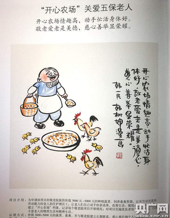 值得一提的是,此次推介的每一個慈善項目都配上了生動有趣的漫畫,如在關愛五保老人項目的漫畫中,一位老人笑呵呵地喂養身邊的小雞,一派其樂融融的田園場景躍然紙上。漫畫作者韓一民是安徽省美術家協會理事,“當時接到為這31個慈善項目畫漫畫的任務后,耗費了2個多月的時間進行創作,31幅漫畫每張都畫了上百張草稿,就是希望讓市民一眼就能了解這個項目,并參與進來。”