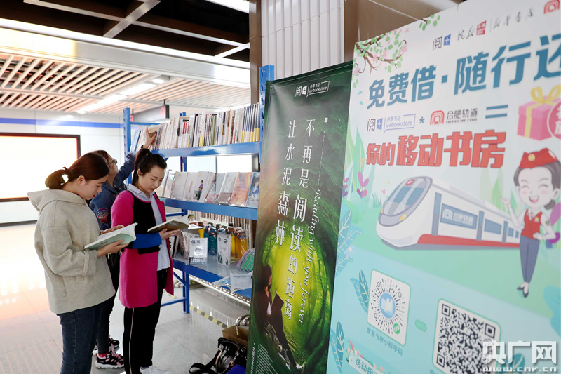3月31日上午,央廣網記者在合肥地鐵1、2號線大東門站、紫廬站、朱崗站、三里庵站、十里廟站、東七里站六個站點內看到,這些站點均設立了移動書架,投放包含文學類、社科類、精品少兒類等50多個品種、共計2000余本書籍,方便乘坐地鐵出行的乘客借閱圖書。