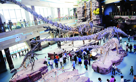 ◆ 10月1日,位于合肥市政務區的安徽省地質博物館內,人們在參觀大型恐龍骨架。當日是國慶假期第一天,許多市民帶著孩子走進科普場館,學習知識,開闊眼界。徐旻昊攝