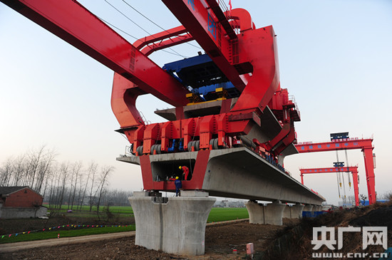 上月16日,太和縣境內,商合杭鐵路工地正在進行架梁作業。(資料圖片)