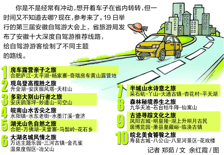 中安在線訊 據安徽商報消息 你是不是經常有沖動,想開著車子在省內轉轉,但一時間又不知道去哪?現在,參考來了。 19日舉行的第三屆安徽自駕游大會上,省旅游局發布了安徽十大深度自駕游推薦線路,給自駕游游客繪制了不同主題的路線。