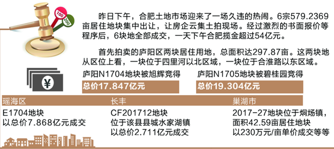 昨日,合肥1月份最后一場土地拍賣圓滿“收官”,六宗地塊使用權(quán)成功轉(zhuǎn)讓,共攬金54.44億元。超過30家的房地產(chǎn)企業(yè)參與“搶地大戰(zhàn)”,其中,廬陽區(qū)超百畝居住用地(位于合淮路以東、棗園路以南)引來十幾家開發(fā)企業(yè)爭搶,最終“花落”旭輝地產(chǎn),最高樓面價達到10752元/平方米。合經(jīng)區(qū)88.13畝商業(yè)、居住用地(宿松路以西、紫蓬路以南),將會引進醫(yī)療手術(shù)機器人運營企業(yè)區(qū)域總部、研發(fā)中心和應(yīng)用推廣中心入駐。