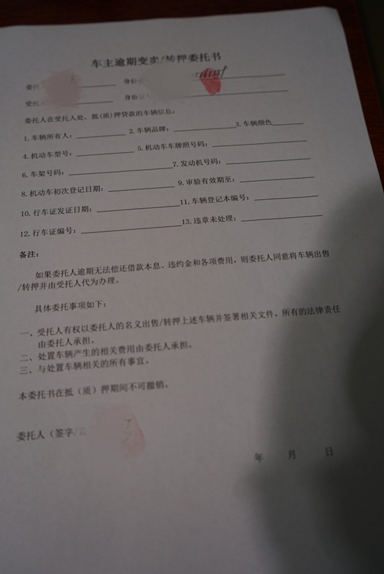 名目繁多的合同和委托書為進(jìn)一步套牢客戶,客戶在簽訂合同時,除了提交身份證、行駛證、車輛購置稅發(fā)票復(fù)印件等材料,還要簽訂以及提交還款說明書、車輛抵押借貸合同、委托書、承諾書和聲明(聲明后果自負(fù))、客戶熟人名單(方便日后催款)、車輛質(zhì)押借款合同(為拖車做準(zhǔn)備的,如果客戶違約,公司就會進(jìn)入質(zhì)押環(huán)節(jié))等等多項(xiàng)材料。